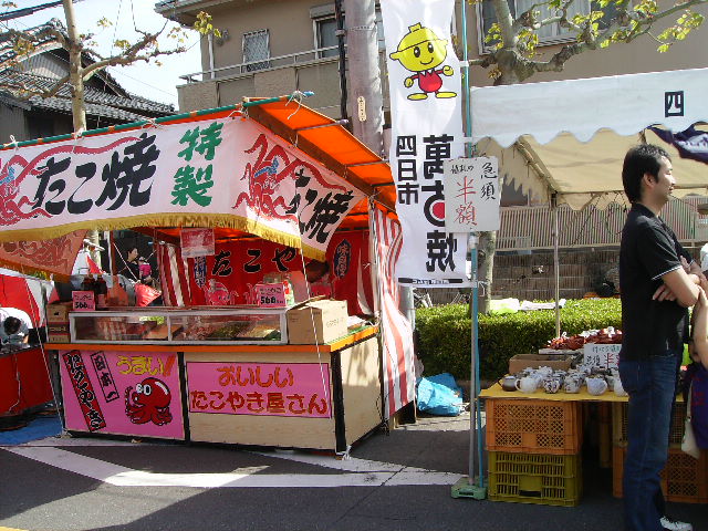Here are some stalls at the matsuri. The left sells takoyaki, or grilled octopus. The stall on the right sells the high-quality ceramics for which the Banko Matsuri is famous.