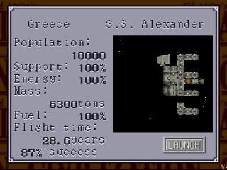 ![]() 1867: The Apollo Program and the First Man in Space Note how I have reduced my tank quota on the front, because my citizens were rioting (prior to building the Women's Suffrage Wonder). Note that I can also finally see the Japanese civilization's city to the southeast — because it showed up on pictures from space when I launched my first spaceship. | ![]() The Greeks' Spaceship, the S.S. Alexander It is ready to launch, with an 87% probability of success, and it is only the mid-20th century. Why part of the spaceship (a structural portion) is not attached to the rest is a mystery to me. |