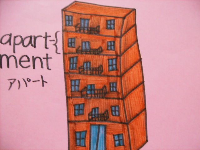 The Flashcard for "Apartment" (most Anglosphere-biased textbooks assume everyone lives in a "house" and fail to teach "apartment," but the majority of Japanese children live in apartments, so I feel it is useful, so I made this flashcard)