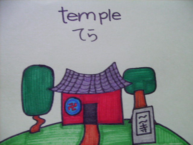 Many Anglosphere-biased textbooks teach "church." But how many Japanese people actually go to church? Here is a word they are more likely to need to say, "temple." Note the manji on the temple, a symbol of Buddhism (similar to the swastika, but reversed). Here, that's a recognizable symbol of Buddhism used on many maps and temples. In America, I'd get the Anti-Defamation League on my ass. But this isn't America!