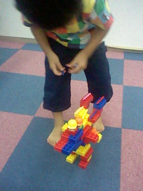 This is my five-year-old student standing next to his creation, a mech-type robot created with a cheaper Duplo knockoff. Note the crayons for missiles. For his protection, I have made sure not to show his face, and will only say that his nickname is "Gin-chan."