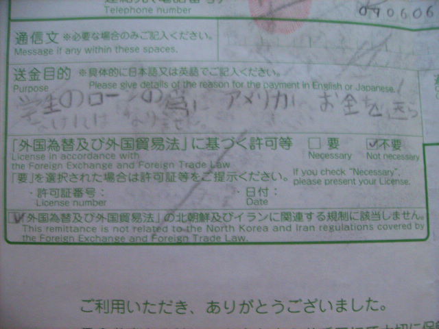 My International Payment Application and Declaration Form (note that I wrote in kanji, hiragana, and katakana "Gakusei no roon no tameni okane wo okuranakereba narimasen," which means "I have to send the money for my student loan")