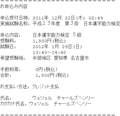 Back in October, I passed the KanKen Nana-kyuu, certifying me for 640 kanji. But I don't feel that properly certifies my ability in kanji (I estimate I know more like ~1,000+). Therefore, today (the last day to do so), I registered for the Kanji Kentei Go-kyuu, which will certify me for 1,006 kanji if I pass it. Here is the receipt that arrived in my e-mail inbox: