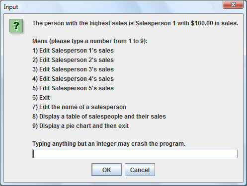 December 6, 2012: ITP 120 Final Exam Rescheduled I just don't think I'll be ready by Sunday for the exam (I was originally scheduled to take the exam on that day). At a rate of 10 textbook pages per day and 20 per day on the weekend, it would have been doable, but that was before Chapter 14 started. Chapter 14 is straight out of Hell itself! Basically Chapter 14 is an attempt to teach almost the entire Java Swing GUI in one chapter. There is a ton of pre-fab code, a ton of new commands, concepts that are very difficult for me to wrap my head around (unless I spend hours experimenting with them), etc. There is no way I can cover the 82 pages of Chapter 14 with the necessary level of quality by Sunday. Therefore, I have postponed my final exam from 12/9 to 12/15, which will give me a much more reasonable ten calendar days to study for it. Unfortunately, this has a ripple effect. I'm not sure where my DSST World Religions study time is going to come from, since I take that exam on 12/16. Should I just do the study guide and go in there and see if maybe I can pass it? While that might work if I were pursuing it for college credit, that's not the reason I'm taking it. I want to have a decent understanding of the world's religions. I was already having doubts about being able to do sufficient research on the world's religions by 12/16, but now, I'm really doubtful. I had really wanted to read the Quran and the New Testament. I have barely done any reading of either. I had hoped to visit both a mosque and a synagogue. I have done neither. So maybe I can go in and pass that DSST, but that'll mean I'll have basically BSed arguably the most important subject in the history of mankind. Do I really want to do that? So I'm afraid I'm going to have to postpone that test into next year. That's something that just can't be rushed. You can't BS Yahweh, God, Allah, Ahura Mazda, the Heavenly Bureaucracy, or whatever the heck you believe in, after all. So...for now, the World Religions DSST shall be put on hold. I'm pretty sure that I could go in and pass it, but once I passed it, I would no longer have an excuse to read the Old and New Testaments, the Quran, go to the houses of worship for those religions, or that sort of thing, since those aren't the types of things I ordinarily do. I must do them before I take the test, or I might never end up doing them. November 27, 2012: 1/6th of the Way There to Permanent Residency I have a JavaScript script that tracks my progress to permanent residency in Japan. At 11:55 AM, 11/26, this counter reached 16.68%, meaning that I have spent 1 year, 8 months living on Japanese soil (out of the required 10 years for PR). This means I have passed the 1/6th mark. In other words, if I can just keep up what I've been doing so far five more times over, Japanese permanent residency can be mine. November 25, 2012: sales.java Today I finished and sent in sales.java, part of Assignment 3 for my programming course. I went all out on this. We were supposed to make a program that keeps track of five salespeople and their sales and shows this data in a table and tells who the highest seller is. I went above and beyond and added a GUI window pie chart and a gradient background. I wrote the code to make the pie chart and the gradient from scratch. The pie chart involved doing a bunch of fillArc operations and required converting each salesperson's sales to a number of degrees; the gradient object really used my brain to the max as I had to figure out how to make an object capable of drawing gradients of arbitrary size and coloration at the four corners.