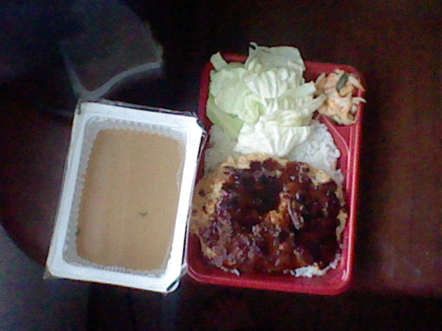 ![]() | Before heading out for Nagoya on June 5, 2011, I made sure to eat a full meal so I wouldn't be tempted to buy an expensive meal in Nagoya. Here we have miso soup, tonkatsu (pork cutlet), a bit of discounted 10 yen cabbage, and some kimchi in the compartment. This is pretty much the only type of Japanese food I know how to cook at this point. All the food in the picture comes out to less than 150 yen, which is a good deal in Japan. Perhaps I will learn some more Japanese recipes in the future. | |