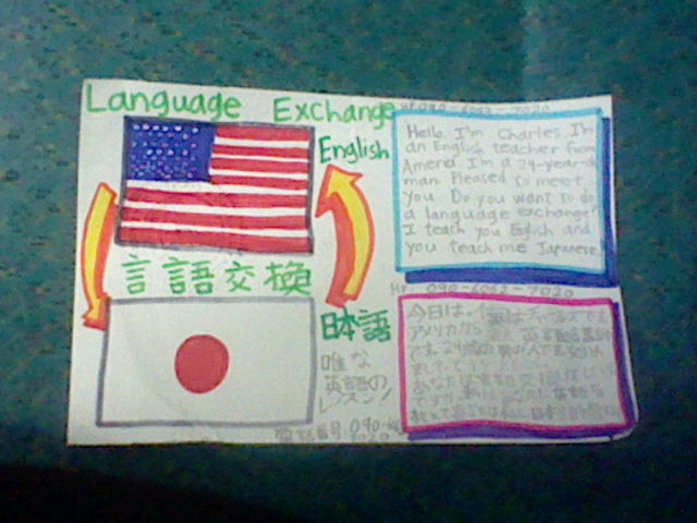![]() | Here is the flyer. Unfortunately, all the colleges I visited in Nagoya (in order to find a bulletin board to post this ad) were buildings instead of outdoor campuses, and were locked by that time. Their outdoor bulletin boards were either nonexistent or not publicly accessible. |