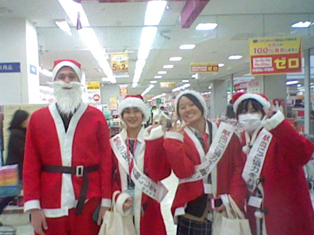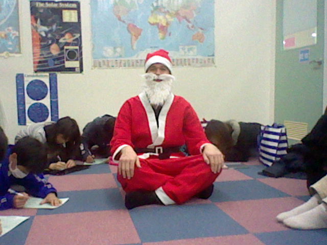 | December 24, 2012: Merry Christmas Eve, and the Big Apple 2012 Christmas Party We had a Christmas party today. I started doing the bulk of my planning last night, and continued planning this morning. I came up with two games to play (the Candy Cane Pass game and a Simon Says-style dancing game to "Santa Claus Is Coming To Town"). We had a raffle with many prizes and other activities, as well. Overall, I think the party went pretty well. ← 四日市市の2012年サンタ年会 Yokkaichi City's 2012 Santa Convention (not really, but there were a lot of Santas in Kayo Mall. These Santas were actually high school girls trying to get people to donate blood. Note the sashes that say "献血にご協力をお願いします" ("kenketsu ni go-kyōryoku wo onegaishimasu", or "your honorable cooperation in donating blood, please"). |  | ← A Convention of Santas, Part II |  | ← The kids (and some of the parents) are working on coloring sheets, unscrambling words, and word searches with me in the foreground. |  | ← Two Japanese students, two Korean students, and Chasuk (one of the moms) working on coloring sheets, unscrambling words, and word searches at the Christmas Party. |  | ← I couldn't find candy canes here in Yokkaichi for the Candy Cane Pass game. So I got some cardboard, cut out eight candy canes, and painted them to look like candy canes using acrylic paints. The game went relatively well. |