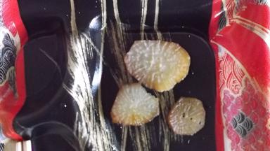 These are some stewed daikon radishes. I made these by boiling them for >20 minutes in water mixed with dashi and soy sauce. That's how the Lawson convenience store cooks them (the manager there told me how to make them). They're an acceptable snack when drinking.