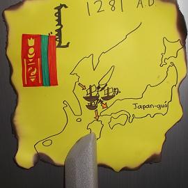 Anachronistic Mongol Map Showing Invasion Plans for Japan (to make the costume more obvious to people who can't figure out what kind of warrior I am)  These are furry slippers that look kind of like hide Mongol boots. Kind of. Well, at least I can wear them in the classroom since they aren't true shoes.