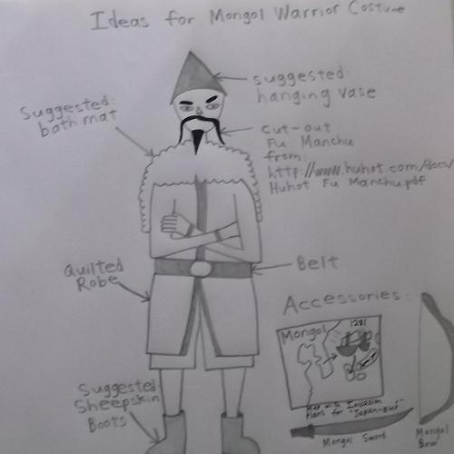 Total cost to produce this priceless costume: ¥965 (~$12.17, doesn't count things I bought but didn't end up using, nor the hours I spent making it) | | October 21, 2012: Designing My Mongol Warrior Halloween Costume I've drawn up the picture to the left of some ideas... Special thanks to the HuHot restaurant's Web site on some good ideas to make a Mongol warrior costume. I'm now going to go out and actually try shopping for some of this stuff. I'm going to hit the thrift shop Nandemo Kaimasu and also the ¥100 store, and maybe some others.The tough part is making sure that my costume is recognizably Mongolian and not Japanese. I don't want people to think I'm dressing up as some famous Japanese historical figure. This means I probably can't use a yukata for the robe, and that I must make it really obvious with things like a map labeled in Mongolian and perhaps even a Mongolian flag (anachronistic, but perhaps necessary)... I hope to wear this Halloween costume to the two Big Apple Halloween parties on Saturday and also maybe to a Halloween party in Nagoya. Not sure, yet. |