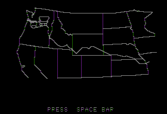 This is the map screen. The 1979 version on the Apple II was the first version to have any graphics; the earlier 1971 mainframe version was only text sent out to schools' teletype systems over an acoustic coupler modem.