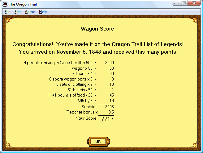 This took several tries on the Windows 3.x version in order for it to work. Most things are quite controllable as long as the player works hard at them (like amassing over 1,000 pounds of food, and using that food to trade for any needed items). The difficult part is getting to Oregon with all the party members still alive. Party members are worth so many points, if one party member dies, it is nearly impossible to make up the score deficit. If two party members die, forget it (because it is not possible to carry in one's wagon enough supplies to improve a score of 5,250 to 7,650). Basically, assuming the player has selected the job "Teacher" for his or her main pioneer (hardest difficulty level but 3.5X score bonus), that means that each player in "Good" health is worth 1,750 points. With five party members, that comes out to 8,750 points, but with four party members, that's only 7,000 points (650 short of beating Stephen Meek). In my case, one party member died, so I spent a very long time on the Barlow Toll Road right before the Willamette Valley repeatedly hunting, then trading my food for oxen. I got 20 oxen and also arrived in the Willamette Valley with 1,141 pounds of food and some other stuff. By going the extra mile to do all that stuff, I was able to make up the score deficit (just barely). Basically, I looked at the problem (how to get my score up to 7,650) and did the math, and was able to reach that score. However, I doubt I could have done this back in third or fourth grade when I was really into Oregon Trail, though. I just didn't have the math/analytical skills to figure out how to work a scoring system like I can now. :-) Basically, my formula is this: - In the beginning of the game, select "Teacher." Teacher, considered the most difficult pioneer job, has a 3.5X scoring bonus. The disadvantage of the Teacher job is that the player only gets $400 to work with at the start (Banker starts with $1600 and Doctor starts with $1200 and the ability to [sometimes] cure sick people, so having only $400 to start is seen as a major disadvantage). However, this is more than enough to start, in my opinion. Invest lots of money in oxen, sets of clothes, and bullets. Invest very sparingly on food and wagon parts, because food is easy to hunt for on the trail, and wagon parts tend to get lost in wagon fires, stolen, or end up on the bottom of rivers during failed crossing attempts, and can always be traded for (and are only rarely needed, anyway). Try to have $100 left over for ferries/Indian guides/toll road tolls.