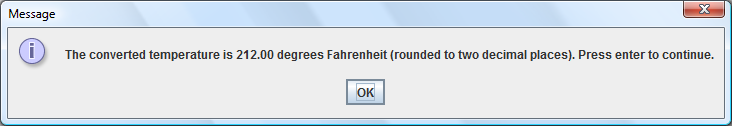 Who was Stephen Meek, anyway? Well, he was one of the early pioneers of the real Oregon Trail, who was a fur trapper and adventurer who had attended public school in...Virginia. He lived from 1805 to 1886 and guided wagon trains. His wagon train was called the "Meek Cutoff." Recently, a movie was made about him.So...I guess my next goal is to get so many scores over 7,650 that I completely remove Stephen Meek from the high scores of Oregon Trail. ;-) November 17, 2012: ITP 120 Midterm Exam Well, I just finished the midterm exam. I got 90.625%. To be honest, that was slightly lower than I had predicted (and I suspect it may not have been all my fault — I found typos on the exam, and some of the code samples looked suspect, like they wouldn't really compile, and in at least one case, I knew the right answer [to a very simple question where I was pretty sure I was right], but it wasn't among the four options listed). However, it's not a big issue. I still have slightly over 100% in this course (410.63 points out of a supposed "maximum" 410) thanks to liberal extra credit from the professor for Assignment 2... So...I don't need to worry at all. According to my calculations from analyzing the grade book, I'll get an 'A' as long as I maintain a 79.21% average on all future assignments in this course... That should be a piece of cake. November 13, 2012: A Window into My ITP 120 Course For Assignment 2, we had to create a bidirectional temperature conversion program. Sure, I could have created a crappy command line-based program and satisfied the requirements. But guess what, I'M A PROGRAMMER! So I decided to flex my GUI application-building muscle and programmed the following rudimentary GUI-based application instead, complete with crude graphics and dialog boxes. The source code weighed in at over 6K and this took most of tonight...