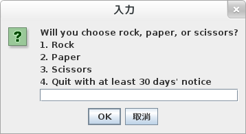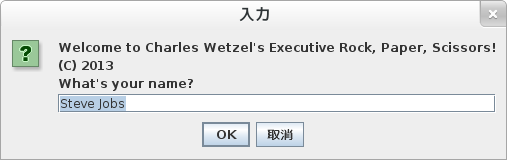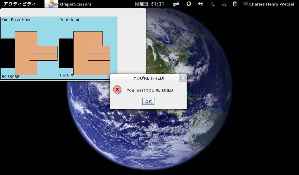 Click here to download the compiled classes and the .java source code files! It's only 10K zipped! To run it, unzip it and type java RockPaperScissors in either CMD.EXE on Windows or Bash on Linux. This assumes, of course, that you have Java installed on your computer (I have only tested it under Linux, but it likely works under other operating systems, as well). June 24, 2013: Executive Rock, Paper, Scissors Beta Version 0.95 I just wanted to see if I still knew how to write basic Java code. It has been more than six months since the ITP 120 class, and I wasn't sure if I still could, even though I have regularly reviewed the commands I learned using Anki. So I sat down at my Fedora 17 Linux laptop and typed out 184 lines of code and compiled them from the Bash shell. This small game, with crude graphics using JPanel/DrawPanel and modal dialog boxes via JOptionPane, was the result. Nothing special, but at least I still remember my basic Java, which is good, I guess: