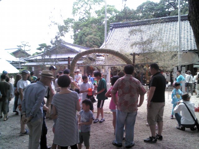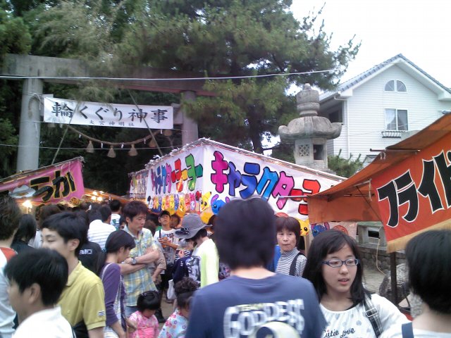 | One of my junior high school students, Chisami-chan, told me that there was going to be a matsuri (festival) this weekend called "Wakuguri. I went there, arriving just 31 minutes before sunset (which was at 7:11 PM). I took the following pictures. Later, I wanted to find information on what the Wakuguri Festival actually is. I couldn't find any significant English information, so I did a search in Japanese. The Japanese version of Wikipedia contains an entry (the English version, surprisingly, does not). This is the Japanese entry: 大祓(おおはらえ)は、6月と12月の晦日(新暦では6月30日と12月31日)に行われる除災行事である。犯した罪や穢れを除き去るための祓えの行事で、6月の大祓を夏越の祓(なごしのはらえ)、12月の大祓を年越の祓(としこしのはらえ)という[1]。6月の大祓は夏越神事、六月祓とも呼んでいる。なお、「夏越」は「名越」とも標記する。また、宮くぐり祭や輪くぐり祭とも呼ばれる。 My translation: Ooharae (Great Purification) is an event for protecting against catastrophes that is held on the last day of the month (on the new calendar [the Gregorian calendar instituted during the Meiji Period, as opposed to the old lunar calendar] June 30 and December 31). It is an event of purification for removing sins that people have committed and uncleanness and making them go away; the one in June is said to be the "Nagoshiharae" (Summer Purification Rites) and the Ooharae in December, the "Toshikoshi no Harae" (End of the Year Purification Rites). June's Ooharae is also being called the "Natsugoshi Shinji" (Summer Purification Rites Shinto Ritual) and the Rokugatsu Harae (June Purification Rites). Furthermore, "Natsugoshi" is also titled "Natsugoshi [with different kanji]." And it is also called the Miyakuguri Festival and the Wakuguri Festival. |  I took this picture of some of the people and stalls precisely 30 minutes before sunset. |  The Front of Oomiya Jinsha Jinja (大宮神社神社) |  This straw rope ring has something to do with the purification rites, I know it. The "Wa" in "Wakuguri" is the character 輪, or "ring," that's why. |  Close-Up of the Ring |  A Stall with Multiple Koori Characters (氷) I suspect that they serve kakigoori (かきごおり), which is crushed ice flavored with syrup (much like a snowcone). |  Okonomiyaki (お好み焼き) Stall |  One Minute Before Sunset (7:10 PM) I stayed a few more minutes, then went home. I didn't spend any money. I just got these pictures. |