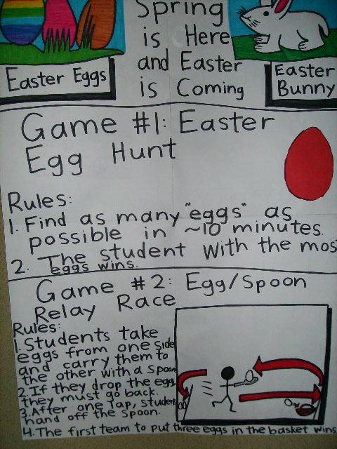 | 2. Easter Egg Hunt This game is fun for all ages. It is best for a parties or other events where much learning is not required, as there is really very little way to make this educational. Here are the rules:- Hide "eggs" all around the classroom. These may be construction paper eggs, plastic eggs, or even hard-boiled eggs.