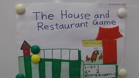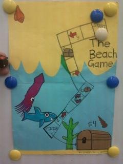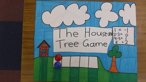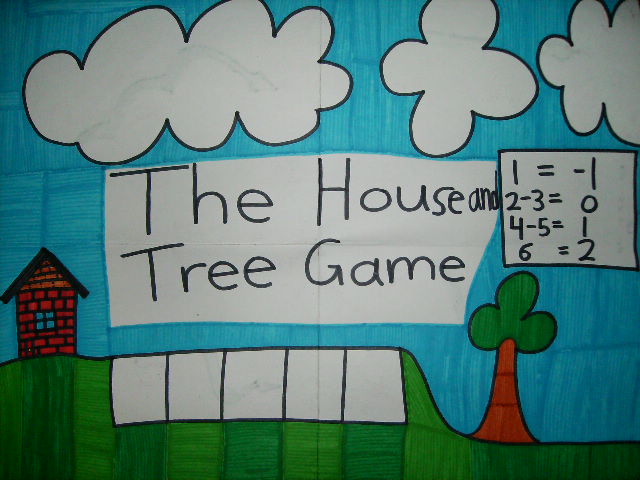 | 4. The House and Tree Game This is a very simple board game. It can simply be drawn on the whiteboard instead of making a fancy poster like mine, but I prefer to be a bit artistic. Here are the rules:- Each team of students has a magnet of a different color as a game piece. They both start in the grass just left of the leftmost white square.