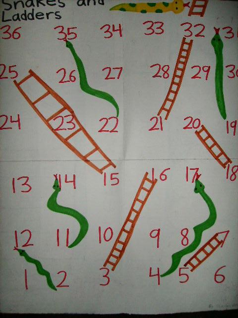 | 5. Snakes and Ladders This is a simple game, and a good one for practicing numbers between 1 and 36 (or whatever range the teacher chooses) because the students can say the number on which they land. Here are the rules:- Students start at 1. Their game pieces are magnets. This game is a poster that is hung on the board.