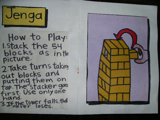 | 6. Jenga Jenga is a great game for students 10 and over. Unfortunately, younger/wild students tend to knock the tower over early in the game through carelessness or on purpose, which is an extreme annoyance since it can take a few minutes to rebuild the tower. Therefore, it is only recommended that teachers use this game with more mature students. Even adults enjoy this game. It can be made educational by asking a quiz question or requiring an answer to a flash card for a student to take a turn. Here are the rules:- Stack the 54 blocks as in the picture [criss-cross].
