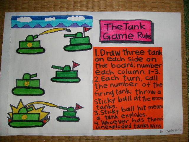 | 7. The Tank Game This is the Tank Game. It is very simple. Here are the rules:- Just draw six total tanks (three on each side of the board) with whiteboard marker. Number them 1, 2, and 3.
