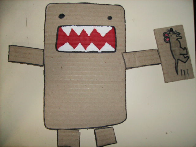 | 8. Domo-kun versus Nezumi-chan This game is good for practicing spellings of vocabulary words (preferably past words, as current words would be too obvious), and is very economical to make. Cardboard works well, since Domo-kun is naturally brown. Magnets are affixed to the backs of the pieces (I used regular tape). I drew the mouth with red and black marker and correctional fluid. There are six pieces in all:- Nezumi-chan (the mouse)