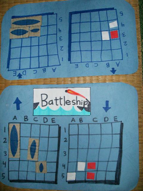 | 9. Battleship Here is a game that is easy to make out of construction paper and cardboard. It is great for students over 10 years of age; in fact, my teenage students thought it was quite fun, and my boss liked it so much, she had me play it with her several times on breaks! However, do not try this game with students under 10! Students under 10 are usually exceedingly poor Battleship players, and playing even a single game can suck up an entire lesson block, as kids under 10 are very sluggish to choose spots to fire on, and choose them at random without regard to strategy, resulting in long, pointless games that are fun for neither the teacher nor the students. Therefore, it is probably a wise idea to prepare an alternate game for the young kids on Battleship week.Rules: - Players must not be able to see the ships of the other players. The picture is perhaps a bit misleading since both boards are in clear view of each other. In a real game, players should either be separated by a divider, or be far away from each other.