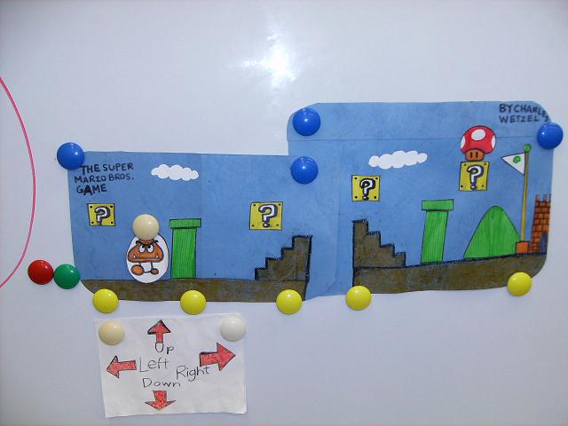 | 10. The Super Mario Bros. Game This game simulates a level of the original Super Mario Bros., a game which Japanese children are still familiar with 26 years later thanks to re-releases such as New Super Mario Bros. On an interesting note, the goomba pictured (the brown, mushroom-like monster) is known as a kuribo- in Japanese. "Kuri" is the Japanese word for chestnut and "bo-" or "bou" means "boy." Chestnut boy.The rules that I have formulated are very complicated and I advise against trying to follow them to the letter. A teacher wanting to use this game should come up with a similar board to mine and come up with his/her own rules or use mine as a rough guide rather than following my rules religiously. Here are my rules: - Each team of students has a magnet. I recommend a red magnet for Mario, green for Luigi, white for Toadstool/Kinopio, and yellow for Princess Peach/Wario. All teams start left of the game board.