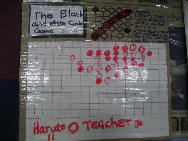 | 11. Go Moku Narabu Although the name is Japanese (taught to me by my students), I originally learned it in Taiwan, where it is also played. It is very simple both to make and play. Basically, I just drew a 15x12 grid on some paper, glued that paper to a piece of cardboard, did a bit of illustration, and covered the whole thing in plastic tape to turn it into an erasable board onto which board markers could be used.Here are the rules: - Players play Rock, Paper, Scissors to determine who goes first.