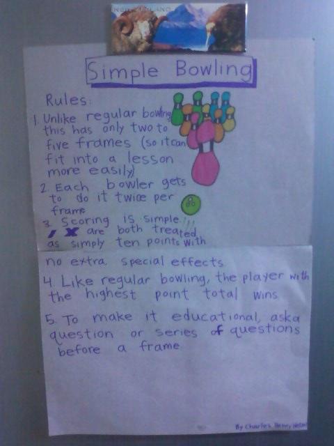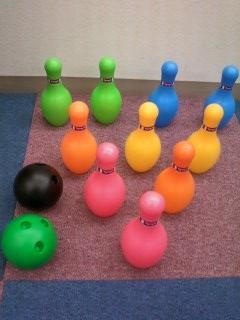 | 12. Simple Bowling This is like bowling, but simpler (fewer frames, less complicated scoring). It is good for kids because kids like bowling. It can be used with a wide variety of linguistic tasks — ask a question before each frame and have students answer it.It is a great game when there are only ten minutes until work and one needs a game quickly, because it can be bought on the way to work at just about any toy store or 100 yen store. However, be careful of the bowling sets made of cheap, brittle plastic, which will break after a class or two, particularly with a really hyperactive student. The better sets will cost several hundred yen or more and are made of slightly softer, more flexible plastic that will not break. The poster that I made is entirely optional. The rules: - Unlike regular bowling, this has only two to five frames (so it can fit into a lesson more easily).