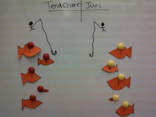 - Divide the students into two teams. Mark each column of fish (see the picture) with a team name.