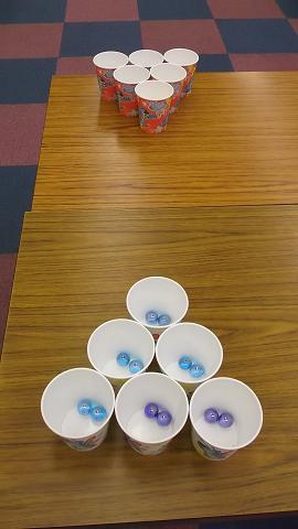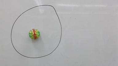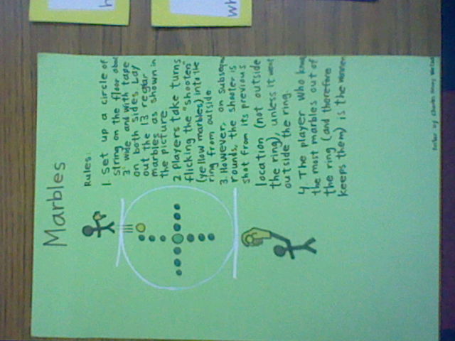 Poster Explaining How to Play Marbles | 50. Marbles Marbles (known in Japanese as biidama [ビー玉]) are a great game for times when the teacher doesn't have much time to prepare a game. Marble sets can be bought at a ¥100 store (plus sales tax, of course, which is set to go up). This game can be made educational by asking the STs questions and eliciting answers from them before each turn.- Set up a circle of string on the floor about 3' wide and with tape on both sides. Lay out the 13 regular marbles as shown in the picture.