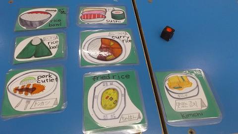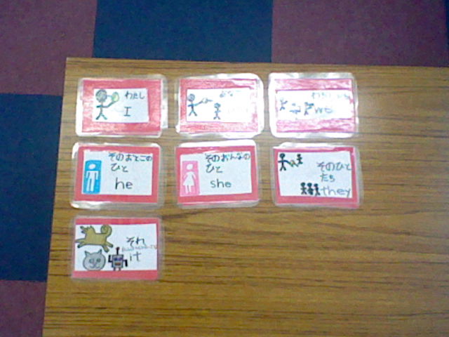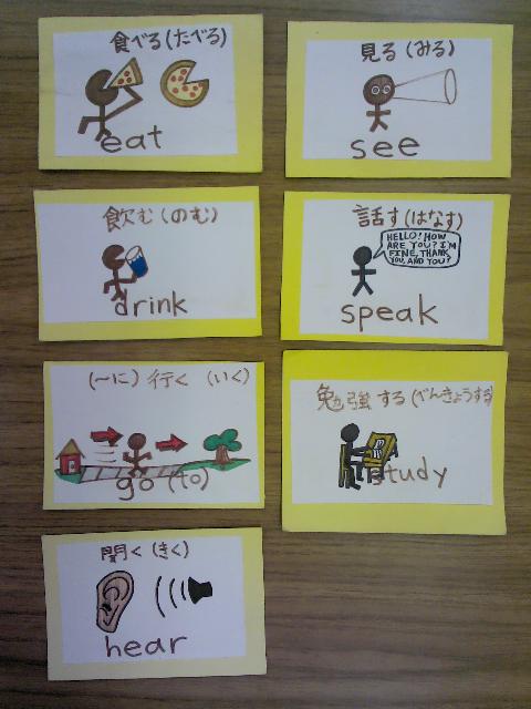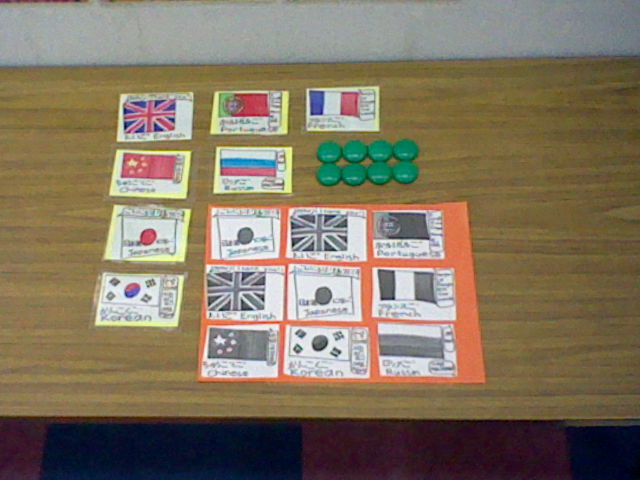 In this picture: language flash cards, a BINGO board, and BINGO chips | 33. Language BINGO If some of the previous games have been light on the learning, this game should be a relief. It is explicitly meant to teach seven vocabulary words: "English," "Chinese," "Japanese," "Korean," "Russian," "Portuguese," and "French." You might wonder why I had Portuguese on there, and it's because Japan has a large minority of Brazilians surpassed only by the Chinese and Koreans living here (and their languages are represented in this game, too). Why is Russian on here? Because Russia is Japan's closest neighbor (look at a map of how close Hokkaidō and Sakhalin come). The Asian languages should all be obvious choices, as should English, but I digress.The rules are the same as standard BINGO: - Every ST starts with a different BINGO board, which doesn't have any chips on it.