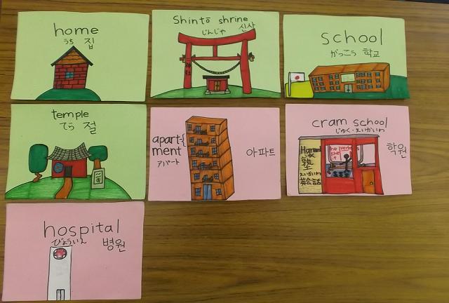 The Set of Cards That Can Be Used with This Game | 28. The Asian Places Game This game is good for teaching students words like "Shintō Shrine" and "cram school" that are relevant to their lives. Textbook series like Let's Go teach places, but there is a definite western bias. Such textbooks will teach "house" or "school" or "church" without bothering to teach words that Japanese, Taiwanese, etc. children actually might use — words like "apartment building" (far more relevant than "house" in East Asia), "temple," etc. Basically, the purpose of this game is to drill these seven words from the flash cards. Here are the rules:- Scatter the cards around the room.