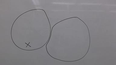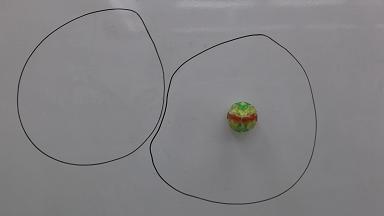 A sticky ball has been thrown at the board. Team 1 (the team that threw it) gets one point, and a circle is drawn around it. Team 2 throws. The sticky ball sticks to a blank space. Team 2 also gets one point, and a circle is drawn around where their sticky ball landed.
