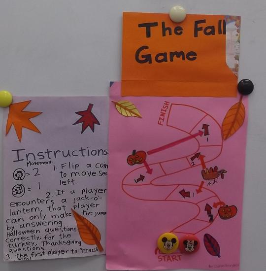 | 31. The Fall Game This game is useful to drill Halloween and Thanksgiving vocabulary words. It can also be used with regular classroom English questions.Instructions: Movement: Heads = 2 Tails = 1 - Flip a coin to move. See "Movement."