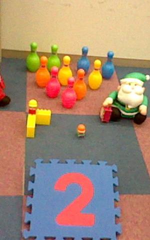 - There are some little Duplo people and a couple of stuffed Santa Clauses. Hitting any of these while bowling and knocking them over results in -1 point for hitting a Duplo person or -2 points for hitting a Santa Claus. These points are only deducted if the object is knocked over, however (so if the Duplo person or Santa Claus is merely brushed by the ball, but the position does not change, do not deduct points).