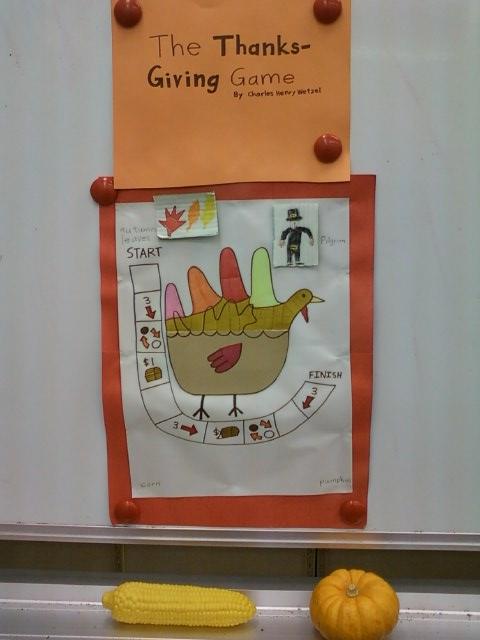 | 36. The Thanksgiving Game This is a good game for Thanksgiving week. I recommend teaching the students words like "turkey," "Pilgrim," "pumpkin," and "corn" using the pictures on the game or the attached flash cards. It is also very quick, which is good for time-starved lessons. Warning: it can be extremely short (if a player rolls a 6 and then a 2, 3, 4, 5, or 6 in the next round, that player will win in a mere two rounds). To counter this, it might be wise to play the game multiple times.Here are the rules: - Have all the players choose colored magnets/chips/etc. to use as game pieces.