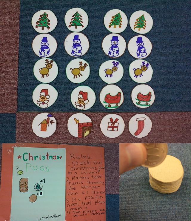 | 38. Christmas POGS This is a good game for Christmas time. The POGS are both fun for kids (especially elementary school-aged children) to flip, and also double as mini flash cards for Christmas vocabulary. They can even be laid out on the floor/table to tell a story (for example, "SANTA CLAUS, who lives near a SNOW MAN at the North Pole, gets into his SLEIGH which has REINDEER pulling it and goes down the CHIMNEY and into the FIREPLACE and puts the PRESENTS under the CHRISTMAS TREE and into the STOCKING").The rules are quite simple: - Stack the Christmas POGS in a column, brown side up.