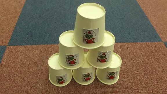 | 39. Grinch Shooting This isn't really that educational, but can be fun, because kids like the crossbow. Just attach a Grinch decal to each cup (I just drew the Grinch's face, took a picture of it, and then printed it six times, cut out the print-outs, and glued them onto the cups). And get a crossbow. Then the rules are as follows:- Stack the cups in a pyramid shape.