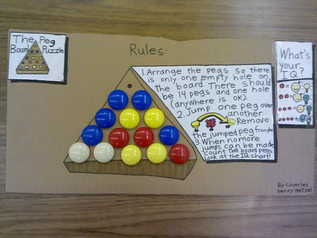 The Peg Board Puzzle Game | 40. The Peg Board Puzzle Game This game, admittedly, has little educational value, but it can be a fun break from class, especially when teaching one-on-one, because it is a solitaire-type game (no second player required). Here are the rules:- Arrange the pegs so there is only one empty hole on the board. There should be 14 pegs and one hole (anywhere is OK).