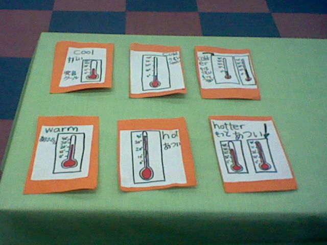 Hotter & Colder Game Memory Cards | 42. Hotter & Colder Game This game is good for teaching temperatures. Make six flashcards/memory cards with pictures on them like the somewhat crude ones to the left. I made them for "warm," "hot," "hotter," "cool," "cold," and "colder." Quiz the STs on these and drill them until the STs know them. Then play this game:- Pick a student. Tell that student to close his/her eyes and count down from 10.