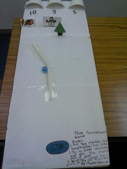 The Snowboarding Game Game Board with Marble | 44. The Snowboarding Game This game, although possessing little educational value, can still be used to reward STs who have answered a question successfully. It takes very little time, too, which is good in those lessons when there isn't much time. Here are the rules:- The ST places the marble (i.e. "the snowboarder") on the START circle.