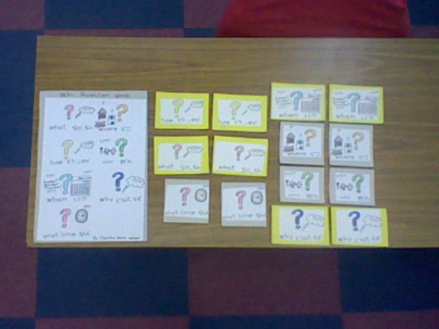 Wh- Question Word Memory Cards (right) with Poster (left) | 52. Wh- Question Word Memory This game is a good one for practicing wh- question words (and "how"). I have noticed when teaching at commercial English schools in both Taiwan and Japan than many STs, including ones who have been learning English for many years, often don't know all the wh- question words, yet these words are so important to speaking and understanding English. To make this game and poster, simply write out the seven question words with the Japanese (or other L1) translations and maybe draw some pictures for visuals. Then photocopy two photocopies of that sheet. Mount the original on poster board and cut out the other two sheets and mount them on cards. Use them as a Memory game. Use them as flash cards, too. Here are the rules, which are the same as standard Memory:- Shuffle the cards.