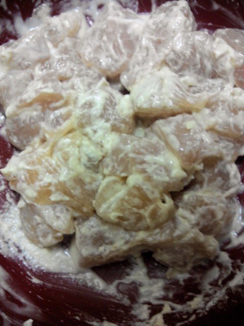 Here's the recipe (ingredients will be in red): First Bowl: The Chicken (use two bowls): Start with ~200 g of chicken. Cut it into ~24 pieces. Put in ~22.5 cc of ryōrishu (料理酒, cooking sake) and leave the chicken with the ryōrishu for at least five minutes. [After the chicken has soaked in the ryōrishu for at least five minutes, a]dd three tablespoons of flour to the chicken and mix.