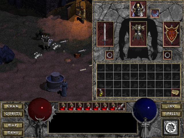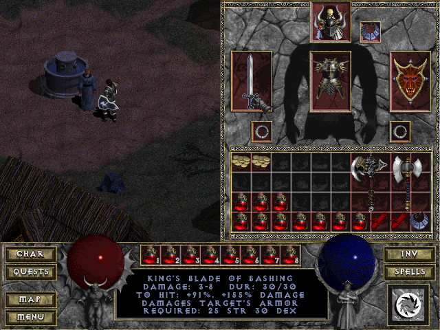 Diablo is famous for its replayability. It has randomly-generated levels that are different every playthrough, different items, different enemies, and different quests. Therefore, I was expecting an experience that was quite a bit different from the first one. Unfortunately, as you can see above, my equipment didn't change at all from the first playthrough to the second playthrough! I didn't find a single weapon or piece of armor that was definitely better than what I already had. One thing that I did discover this playthrough, though, was how to bank items. Before, I had only carried what I could fit in my inventory. This playthrough, I realized that I could stow items in the town of Tristram by just throwing them out on the ground (nobody steals them). The first row of items is Griswold's Edge (a weak sword made on an anvil from the depths of hell), Nai's Light Plate (good for boosting total mana), and Obsidian Plate of the Lion (+60 HP is nice, but its armor class was lower than my Jade Plate armor from the first playthrough). The ring is an Empyrean Band, which I only kept because it is a unique item. From the next row all the way to the right, these are special items I accumulated so that I could cast Apocalypse, the most powerful spell in the game. One's Magic stat has to be 117 to cast Apocalypse, and I maxed my innate Magic stat out at only 50, so lots of equipment is necessary to boost it beyond that. The Blade of Sorcery, Armor of the Stars, Shield of Brilliance, and Amulet of Brilliance all add significantly to the Magic stat, meaning that I had enough Magic to be able to cast Apocalypse if I equipped all these things. However, I didn't end up casting Apocalypse because I didn't find a single Apocalypse scroll this playthrough (only the two from the first playthrough), and didn't want to waste such valuable scrolls frivolously. On the far right are the two Apocalypse scrolls that I got from the first playthrough.