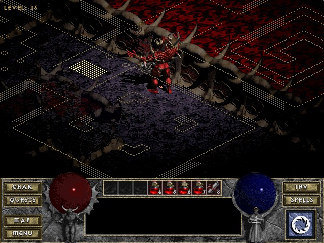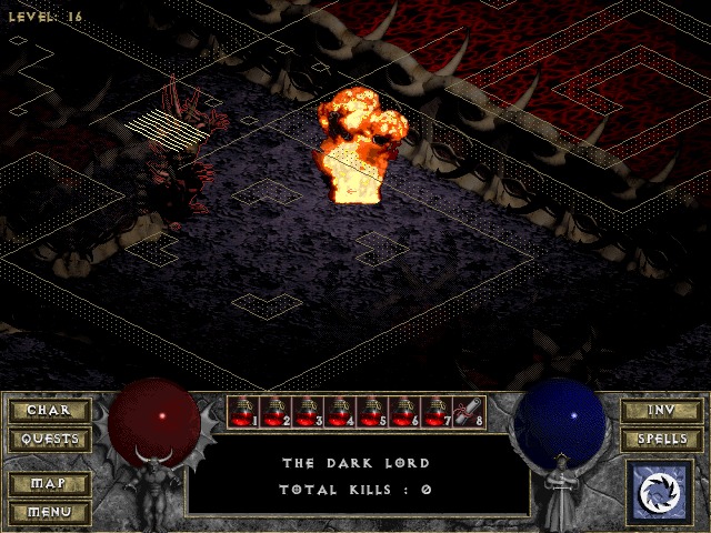 Above is Diablo spraying blood. I have just killed Diablo! And below is the ending screen. My opinion is that the game was lots of fun on the first playthrough, but on the second playthrough, there were many annoyances (in other words, I think the replay value is vastly overrated). The quests were mostly the same (for example, I got Gharbad the Weak again). A few of the enemies were different (I fought Snow Witches this time), but they were just palette-swapped versions of other enemies I had already fought during the first playthrough. I didn't get any new equipment that was better than my old equipment. I might play through this game again someday, but I would want to try it on a different class, not Warrior. Although honestly, I would rather spend my time playing through Diablo II or III than playing through this again.